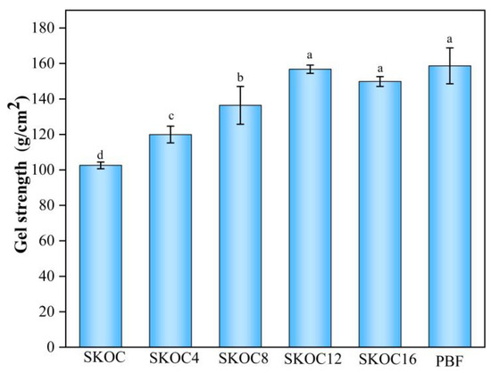 Gel strength is defined as the initial force required to disrupt a gel, which reflects the integrity of the gel’s structure [45]. As shown in Figure 8, the initial gel strength increases with the addition of oil to the emulsion gel. This is because the incorporation of oil helps establish a more compact network, possibly hardening the gel structure, thus enhancing the gel strength [46]. However, the further addition of oil causes a decline in gel strength for SKOC16. This reduction results from excessive oil droplets expanding the distance between molecular substances, disrupting their interactions, and subsequently weakening the gel. Notably, the texture and gel strength of SKOC12 closely resemble those of pork back fat, underscoring its significant potential as a fat substitute.