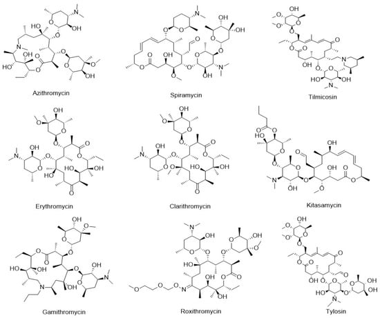 - Kaiser, G. Protein synthesis inhibitors: Macrolides mechanism of action animation. In Classification of Agents Pharmamotion; The Community College of Baltimore County: Baltimore, MD, USA, 2009. [Google Scholar]