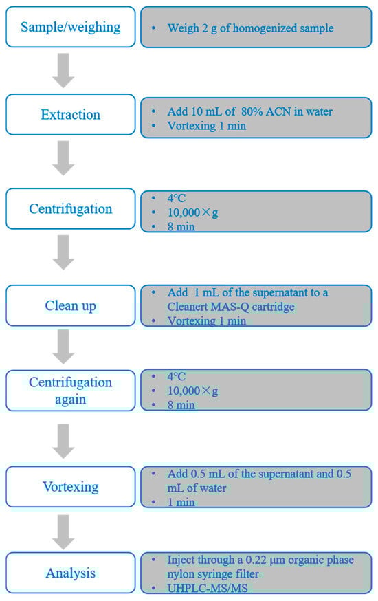Sample preparation was carried out following procedures established in our previous studies [19], with the detailed protocol illustrated in Figure 2. The instruments used in sample preparation included the CAT NO. 945066 digital multi-tube vortex mixer (Talboys, Wrens, GA, USA), the 5810R centrifuge (Eppendorf, Hamburg, Germany), and the Vortex Genie 2 vortex mixer (Scientific Industries Inc., Bohemia, NY, USA).