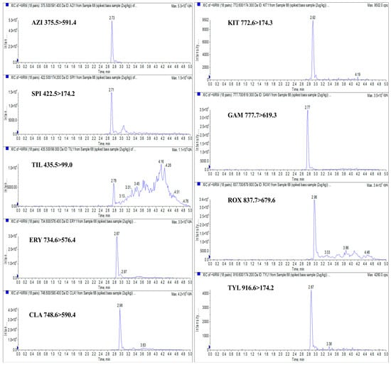 Compared with conventional HPLC, UHPLC offers significant advantages, including superior separation efficiency, faster analysis times, higher sensitivity, and reduced consumption of organic solvents. These improvements make UHPLC particularly well-suited for high-throughput trace-level detection of contaminants [38]. The continuous advancement of LC technology has led to a qualitative leap in the rapid screening of chemical residues in food. In this study, UHPLC conditions were adapted from our previously reported method [19]. Chromatographic separation of the target analytes in spiked largemouth bass muscle samples was performed using a Waters ACQUITY UPLC BEH C18 column (50 mm × 2.1 mm; 1.7 μm), with a mobile phase consisting of 0.1% formic acid in water and 0.1% formic acid in ACN under gradient elution. The inclusion of 0.1% formic acid not only facilitates protonation of the analytes for enhanced ionization in the mass spectrometer, but also improves chromatographic peak shape and resolution during LC separation [30]. Currently, the column temperature for UHPLC separation of MACs is set at 40 °C, which generally yields good separation results [13,32]. The flow rate is typically optimized based on the gradient elution program and the length of the chromatographic column to ensure separation of target compounds within the elution time. For UHPLC, the flow rate generally ranges from 0.2 to 0.5 mL/min [13,32,39]. Based on the findings from these studies, we ultimately selected a column temperature of 40 °C and a flow rate of 0.4 mL/min. The extracted ion chromatograms (XICs) of blank largemouth bass muscle samples spiked with 2 μg/kg of AZI, SPI, TIL, ERY, CLA, KIT, GAM, ROX, and TYL are presented in Figure 3. Figure 3 demonstrates that the spiked sample exhibited sharp and symmetrical peaks for quantitative ions of all nine macrolides, with no evidence of peak tailing. Due to the high selectivity of the MS/MS procedure, precursor/product ion peaks for the analytes are well distinguished, with retention times of 2.73, 2.71, 2.78, 2.87, 2.96, 2.92, 2.77, 2.96, and 2.87 min, respectively.