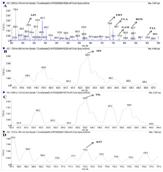 MS spectra of AZI, ERY, CLA, GAM, ROX, and TYL (A), SPI (B), TIL (C), and KIT(D). Note: A precursor ion m/z ± 0.2 was allowed.