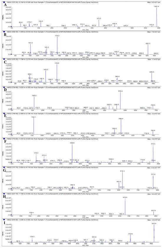 MS/MS spectra of AZI (A), SPI (B), TIL (C), ERY (D), CLA (E), KIT (F), GAM (G), ROX (H), and TYL (I).