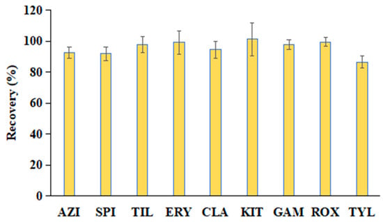 Extraction recoveries of the nine MACs in largemouth bass muscle samples spiked at 200 μg/kg using the proposed QuEChERS method (n = 3).