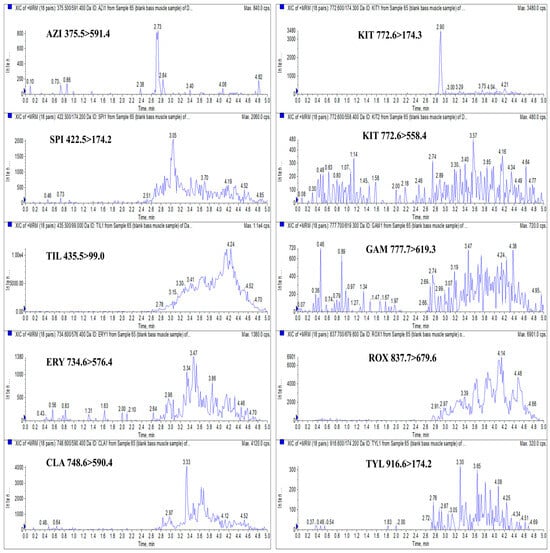 XICs of AZI (375.5 > 591.4), SPI (422.5 > 174.2), TIL (435.5 > 99.0), ERY (734.6 > 576.4), CLA (748.6 > 590.4), KIT (772.6 > 174.3 and 772.6 > 558.4), GAM (777.7 > 619.3), ROX (837.7 > 679.6), and TYL (916.6 > 174.2) in a blank largemouth bass muscle sample.