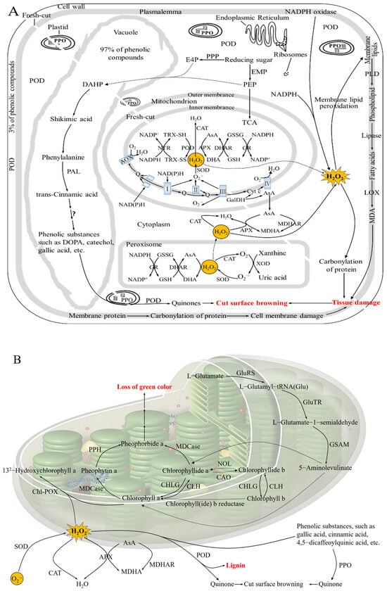 The possible mechanism of cut surface browning (A) and green color loss (B) in fresh-cut fruits and vegetables.