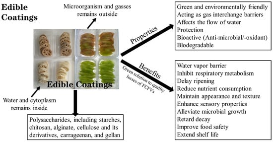 Using edible coatings as a packaging method increases the shelf life of FCFVs [22]. It affects the flow of water, which in turn reduces the amount of moisture lost from the fruit surface. It can also affect the surrounding microenvironment by acting as a barrier to gas interchange (Figure 3).