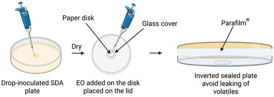 Schematic representation of the vapour phase contact assay (inverted method) used for the determination of Minimal Inhibitory Concentrations (MIC). Fungal-inoculated plates were exposed to different volumes of essential oils (EOs), applied onto a paper disk placed on the lid of the plate, avoiding direct contact with the mould. The plates were then Parafilm-sealed to ensure that volatile compounds remained inside.