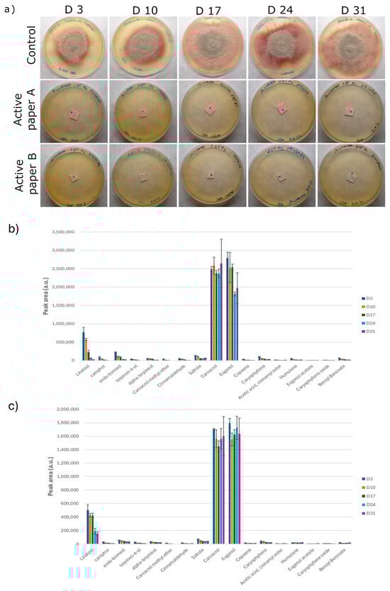 Antifungal activity against B. cinerea (a) and volatile composition analysis by HS-GC/MS of active papers A (b) and B (c) along storage at 4 ± 2 °C (3, 10, 17, 24, and 31 days after paper coating). Volatile compounds are presented as mean area ± SD of each individual peak.