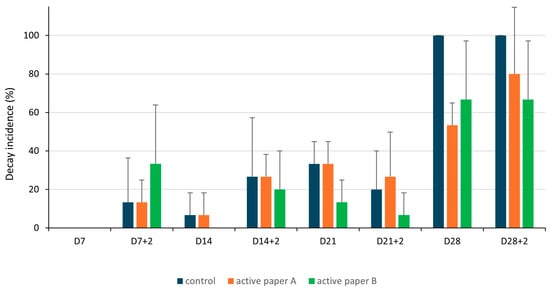 As shown in Figure 3, after 7 days of cold storage plus 2 days of shelf life at 20 °C, some degree of decay was already observed in the control and both treatments (active paper A and B). No significant differences in decay incidence were observed between the control and both active papers after 7, 14, and 21 days of cold storage, with or without an additional 2 days of shelf life at 20 °C. However, after 28 days of cold storage, control tomatoes showed a significantly higher decay incidence compared to those stored with paper A. Specifically, on the last day of cold storage (28 days), 100% of the control fruits showed rot, while the fruits stored with papers A and B exhibited rot in only 53.33% and 66.67% of the fruits, respectively. This effect was also observed when the fruits were transferred to 20 °C for an additional 2 days of shelf life (100%, 80.00%, and 66.67% rot in the control, paper A, and paper B, respectively). At this point, tomato decay in the control fruit was significantly higher than in tomatoes under paper B, although it was not statistically different from paper A due to the high variability among samples within the same treatment. This high variability is reflected in the standard deviation values and likely results from biological differences in fruit susceptibility and uneven disease progression under severe infection pressure. Previous works have reported better protection against pathogen attack on fruit with higher concentrations of essential oils in the formulations [64,65]. However, in our study, no statistically significant differences were observed among the papers, despite active paper A having a higher EOs concentration than active paper B (8% vs. 6%, respectively).