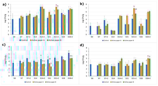Evolution of (a) mesophilic aerobic microorganisms, (b) Enterobacteriaceae family, (c) molds, and (d) yeasts on the surface of tomatoes under control, active paper A, and active paper B treatments after 7, 14, 21, and 28 days of cold storage at 4 ± 2 °C (D7, D14, D21, D28), and after 7, 14, 21, and 28 days of cold storage (4 ± 2 °C) plus 2 days of shelf life at 20 °C (D7+2, D14+2, D21+2, D28+2). Different letters indicate significant differences between treatments each day according to Tukey’s test (p < 0.05).