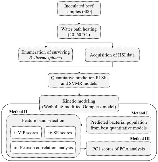 Flowchart of quantitative prediction and kinetic modeling for the thermal inactivation of B. thermosphacta in beef using HSI.