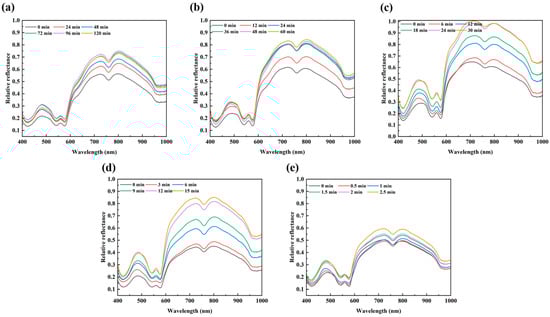 Mean spectra of beef samples at different heating times under different temperatures ((a): 40 °C; (b): 45 °C; (c): 50 °C; (d): 55 °C; and (e): 60 °C).