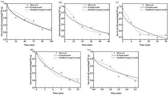 Heat survival curves of B. thermosphacta at different temperatures based on the plate count method ((a): 40 °C; (b): 45 °C; (c): 50 °C; (d): 55 °C; and (e): 60 °C).