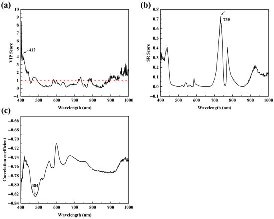 Results for the selection of feature wavelengths (a) variable importance in projection (VIP) scores and (b) selectivity ratio (SR) scores calculated by the PLSR; (c) Pearson correlation coefficients between B. thermosphacta population and spectral values.