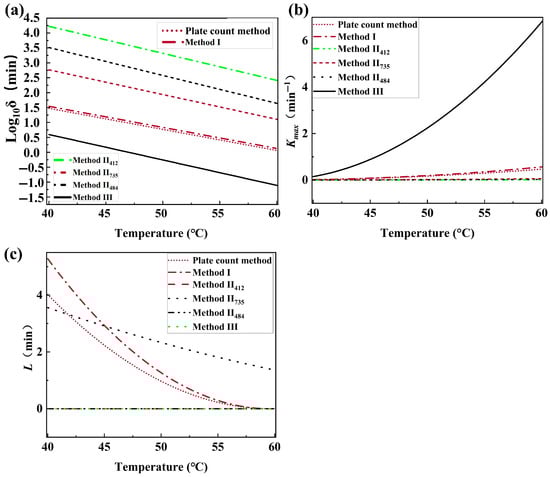 Figure 5 depicts the effect of temperature on the Weibull and modified Gompertz kinetics parameters of B. thermosphacta inactivation. fitted with Weibull models was the scale parameter and decreased linearly with increased temperature (Figure 4a). The maximum survival rate (Kmin, min−1) and the shoulder length (, min) fitted with the modified Gompertz model showed, respectively, an upward and downward concave when the temperature increased (Figure 4b,c). It was observed that the trend of survival parameters (, Kmin, and ) obtained by the traditional plate count method and HSI (Method I, II, and III) was similar as the temperature increased. However, the difference in magnitude made the curves of the survival parameters obtained from Method II and Method III as a function of temperature somewhat different.