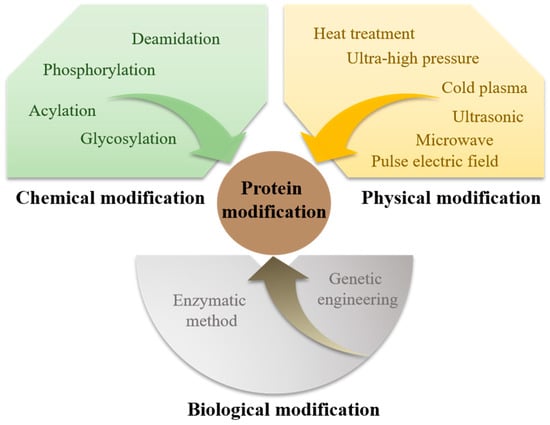 However, the inherent structure of proteins often presents challenges in food processing and applications, particularly with plant proteins, which can impart undesirable flavors, such as beany, grassy, or bitter notes, adversely affecting the overall flavor profile of foods [10,11]. Plant proteins typically possess suboptimal solubility and emulsifying properties, restricting their application in food processing [12]. Moreover, the allergenic potential of proteins, such as those derived from milk, soy, and peas, poses health risks for certain consumers [13,14,15], while muscle proteins are vulnerable to enzymatic hydrolysis and oxidation, processes that can diminish functionality [16]. Furthermore, high-temperature exposure induces denaturation, which significantly impairs the emulsifying and foaming properties of proteins [17]. To address these challenges, a variety of chemical protein modification techniques have been developed to enhance desired functional properties and optimize processing outcomes, thus broadening their applications in the food industry [18,19]. Figure 1 shows the main methods of protein modification.