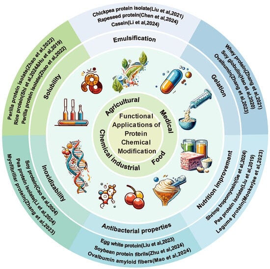 In addition to the previously mentioned chemical modification methods, other techniques, such as cationization, metal ion substitution, and pH-shifting, can also regulate protein structure and functionality [60]. Some examples of chemically modified proteins in recent years are listed in Table 2. These methods enhance antioxidative properties, solubility, bioactivity, and molecular interactions of proteins by either introducing or modifying specific chemical groups within these molecules [61]. Nesterenko et al. [62] studied the encapsulation of vitamins in SPI and found that cationization, which attaches quaternary ammonium cationic groups to the protein chains, enhanced the solubility of the modified SPI, thus facilitating the microencapsulation of ascorbic acid. Li et al. [63] employed pH-shifting to modify PPI, noting that at pH 10, the particle size decreased, while the content of free thiol groups, surface hydrophobicity, and solubility increased, significantly enhancing the gel’s breaking force and water-holding capacity. Yan et al. [64] investigated the impact of pH-shifting and EGCG on the functional properties of SPI. Initially, they treated SPI under alkaline conditions (pH 12) to unfold the protein structure and subsequently refolded it under neutral conditions. They discovered that the alkaline treatment enhanced the protein’s solubility by 34% and increased the surface hydrophobicity approximately threefold. Zhao et al. [65] studied the impact of metal ions on the fiber formation, structure, morphology, and gel properties of soy protein isolate fibers, discovering that the addition of Ca or Mg led to a more ordered structure, elevated β-sheet content, and enhanced fiberization of SPI, inducing the rapid formation of high-viscosity gels. These modification techniques provide a rich toolkit for the functional regulation of proteins and food processing.