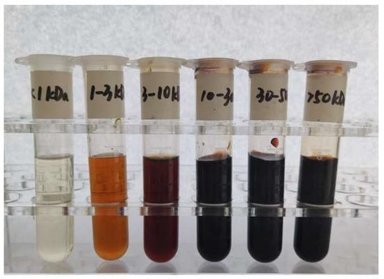 Soy sauce melanoidins and their six fractions with different molecular weights were prepared using resin adsorption and ultrafiltration. There is a clear positive correlation between the molecular weight of soy sauce melanoidins and the degree of browning (Figure 1). The fraction with a molecular weight > 10 kDa demonstrates a higher degree of browning, which is attributed to the formation of melanoidins during a stronger Maillard reaction [31]. In contrast, the fraction with molecular weights < 1 kDa can be negligible, indicating that the fraction contains little melanoidins and is therefore excluded from further analyses. As shown in Table 1, the >50 kDa fraction exhibits the highest content of 0.90 g/100 mL, followed by the 30–50 kDa fraction with a content of 0.61 g/100 mL. Together, the >50 kDa and 30–50 kDa fractions account for 61.89% of the total melanoidins. This suggests that higher molecular weight melanoidins possibly play a significant role in soy sauce [25]. The molecular weight of melanoidins is influenced by both the temperature and duration of the Maillard reaction [13]. The long fermentation time (generally from spring to autumn) and high fermentation temperature outdoors in summer (approximately 50 °C) lead to the complete Maillard reaction in Chinese soy sauce, generating more melanoidins with higher molecular weights via polymerizing amongst low molecular weight melanoidins [9].