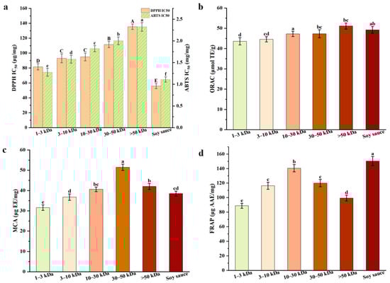 Antioxidant activities of melanoidins fractions with different molecular weights: (a) DPPH and ABTS radical scavenging activity; (b) oxygen radical absorbing capacity; (c) metal ion chelating activity; (d) ferric reducing antioxidant power. a–f (A–D) Different letters in the same row indicate the significant differences (p < 0.05).