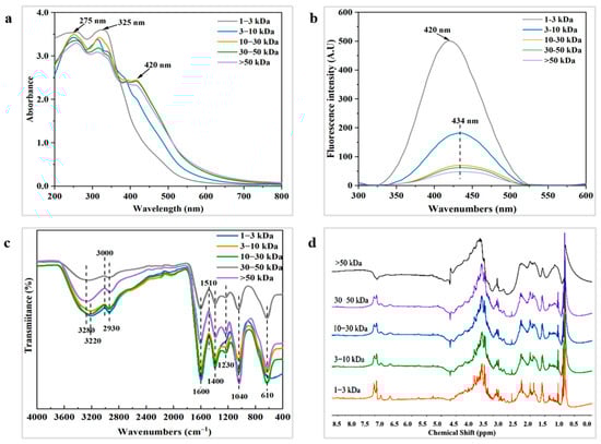 Structural characteristics of melanoidins with different molecular weights: (a) UV–vis-spectra; (b) fluorescence spectra; (c) FTIR spectra; (d) 1H NMR spectra.
