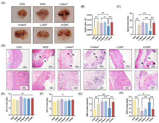 As shown in Figure 1A and Figure S1, the gastric tissue surface of normal mice was smooth and intact. Mice treated with HCl/EtOH gavage exhibited hemorrhage, burn scarring, and erosive lesions. Compared with the model group, macroscopic observation indicated that the low-dose OldT (L-OldT) group showed visibly reduced ulceration, while lesions persisted in low/high-dose NewT (L/H-NewT) and high-dose OldT (H-OldT) groups. Quantitative analysis (Figure 1B,C) revealed that compared to model (MOD), only L-OldT significantly reduced gastric index (p < 0.01) and ulcer score (p < 0.01). L-NewT, H-NewT, and H-OldT showed no significant difference compared to MOD (p > 0.05). L-OldT gastric index was significantly lower than L-NewT (p < 0.05) and H-OldT (p < 0.01).