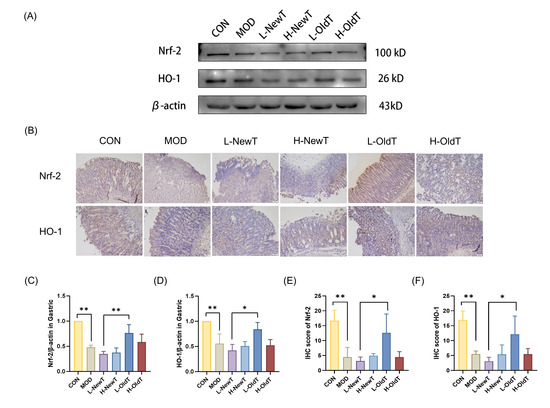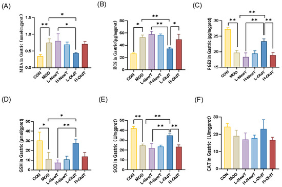 Oxidative stress is considered one of the key factors in gastric mucosal damage [16]. As shown in Figure 2A,B, compared with normal mice, gastric tissues from HCl/EtOH-induced gastric injury mice had significantly higher MDA (p < 0.01) and ROS (p < 0.05) content. Compared with the model group, there was no significant difference (p > 0.05) in MDA and ROS levels in the gastric tissues of the low- and high-dose NewT and high-dose OldT groups, while the low-dose OldT group had a 41% decrease in gastric MDA levels. The gastric MDA and ROS levels in the low-dose OldT group were reduced by 41.72% (p < 0.05) and 35.08% (p < 0.01) vs. MOD group, respectively, and were lower than those in the high-dose OldT and low-dose NewT groups.