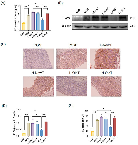 In the state of gastric injury, immune cells increase the secretion of nitric oxide (NO), leading to gastric oxidative damage [23]. As shown in Figure 3A, compared with the normal group, the secretion level of NO in gastric tissues of the model group was significantly increased. Compared with the model group, there was no significant difference (p > 0.05) in gastric tissue NO levels between the low- and high-dose NewT groups and the high-dose OldT group, whereas the gastric tissue NO level of the low-dose OldT group was significantly reduced by 28.41% (p < 0.01), and this effect was significantly stronger than that of the low-dose NewT group (p < 0.05) and the high-dose OldT group (p < 0.01).