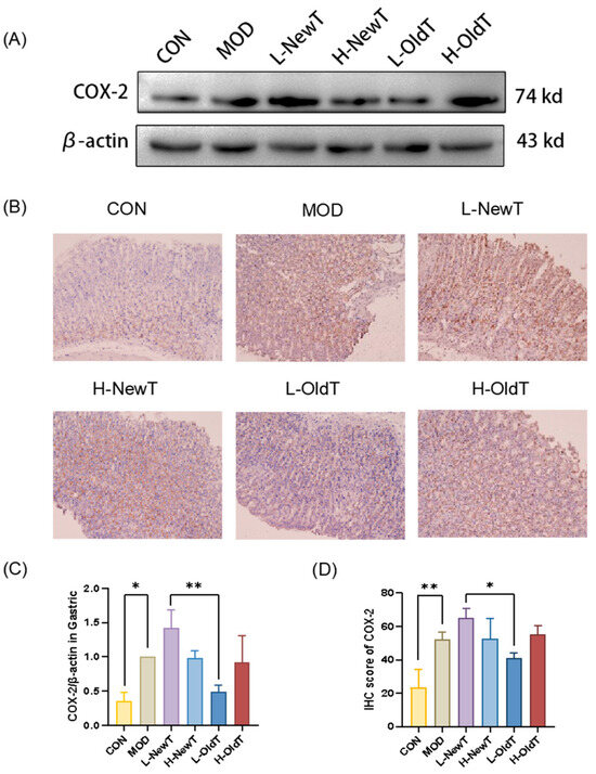 COX-2 is an important inflammatory mediator that converts arachidonic acid to prostaglandin analogs, thereby exacerbating inflammation and aggravating peptic ulcers [19]. As shown in Figure 4, compared with the normal group, gastric gavage with HCl/EtOH significantly upregulated the expression level of COX-2 in the gastric tissues of the model group, the high-dose OldT group, and the low- and high-dose NewT groups. After treatment with a low-dose OldT, the expression level of COX-2 in the gastric tissues was downregulated to a level not significantly different from that of the normal group. The COX-2 expression level in the low-dose OldT group was significantly lower than that of the low-dose NewT group.