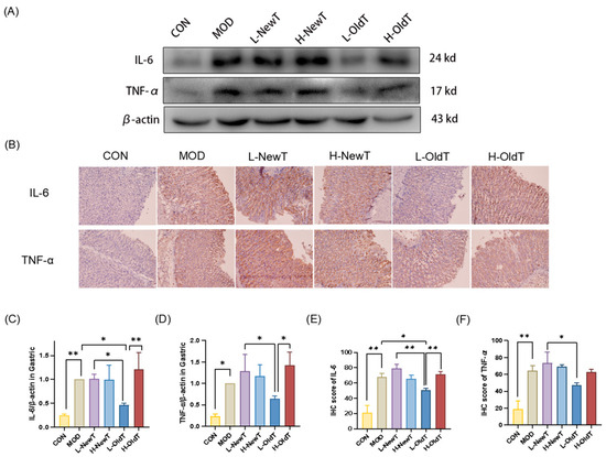 As shown in Figure 5, the expression levels of IL-6 and TNF-α in gastric tissues of the model group were significantly upregulated compared to those of the normal group. There was no significant difference (p > 0.05) in the expression levels of IL-6 and TNF-α in gastric tissues between the low- and high-dose NewT groups and the high-dose OldT group when compared to the model group. In contrast, the expression levels of IL-6 and TNF-α in gastric tissues of the low-dose OldT group were downregulated compared to the model group, with statistically significant differences in IL-6 expression levels (p < 0.05). The downregulation of IL-6 and TNF-α expression levels in the gastric tissues of the low-dose OldT group was significantly stronger than that observed in the low-dose NewT group and the high-dose OldT group. These results indicate that NewT did not ameliorate the abnormal expression of inflammatory mediators in gastric injury, whereas OldT exerted superior anti-inflammatory effects on gastric mucosal injury compared to NewT, except at high doses.