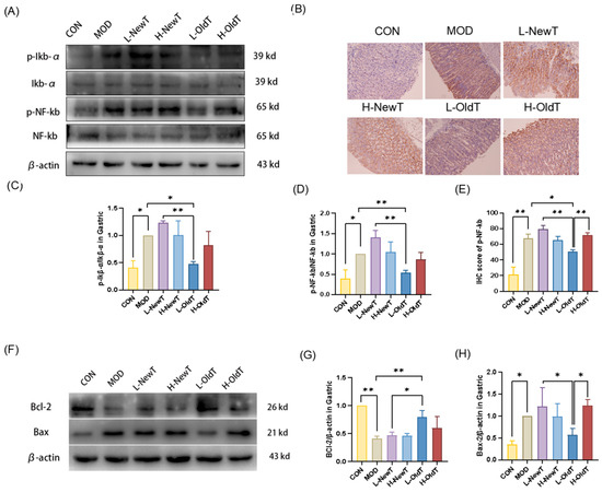 L-OldT downregulates the expression level of inflammatory pathway protein NF-κB p65 and apoptosis proteins at the site of gastric injury. (A) Western blot showing the relative expression level of IκB, p-IκB, NF-κB, and p-NF-κB in gastric tissues. (B) Immunohistochemical staining of p-NF-κB in gastric tissues. (C) Quantification of the relative expression intensity of p-IκB. (D) Quantitative analysis of p-NF-κB expression levels by Western blot. (E) Quantitative analysis of p-NF-κB expression levels by IHC. (F) Western blot showing the relative expression levels of Bax and Bcl-2 in gastric tissues. (G,H) Quantitative analysis of Bax and Bcl-2 expression levels by Western blot, respectively. Data are expressed as mean ± SD. Note: * p < 0.05, ** p < 0.01.