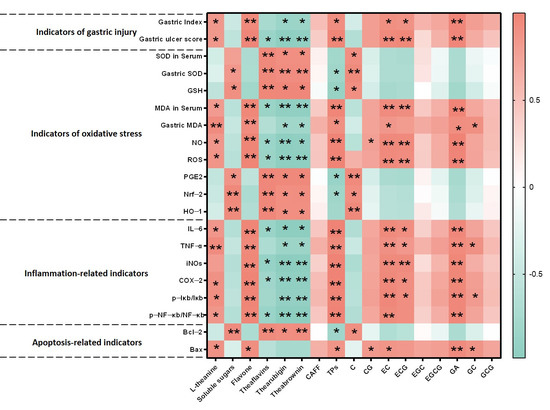 Analysis of the correlation between quality changes and gastric mucous membrane damage-related indexes of Dancong tea. Note: * p < 0.05, ** p < 0.01.