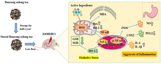 Mechanistically, low-dose properly stored Dancong tea inhibited lipid peroxidation, ROS and NO production, and the expression of inflammatory factors IL-6 and TNF-α, along with inflammatory mediators iNOS and COX-2 through the modulation of the Nrf-2/HO-1 and NF-κB pathways, significantly reducing the deterioration of gastric mucosal damage. In contrast, high doses of Dancong tea and both low and high doses of NewT did not show such effects (Figure 9). Therefore, moderate consumption of stored Dancong tea (≤200 mg/kg BW/d) can help alleviate gastrointestinal damage in individuals with gastrointestinal discomfort, while high-dose tea (≥600 mg/kg BW/d) and new tea are not advisable.