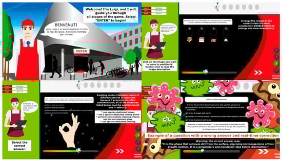 Food Safety Trainer (FST) web app is the result of a collaboration among academic food safety specialists, a large-scale food retail company, and two IT companies (Enigma Tech Srl, Scarperia, Italy, and Creabit Srl, Borgo San Lorenzo, Italy). The FST web app is available at https://foodsafetytrainer.eu, and it was developed with its front-end and back-end components built in parallel. For the visual interface of FST, the front-end, HTML language was used to manage the layout, CSS for the decorations, and JavaScript for the game animations. For the back end, C# was adopted. FST was designed to save and store data of completed gameplay, test duration, and score, for further elaborations. In-cloud data storage was adopted, through RESTful API methodology and compliant with EU General Data Protection Regulation (GDPR) [].