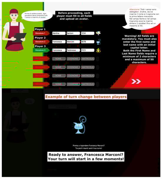 Selection of the number of users and entry of personal details. Example of player turn-taking sequence provided by FST.