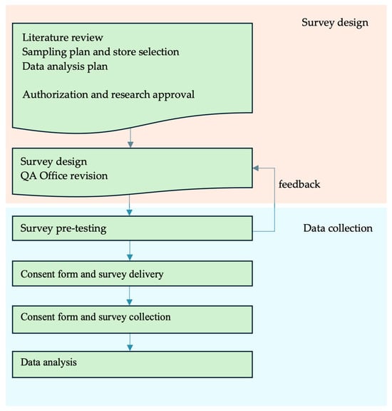 The flow diagram highlights the sequential phases of the research process, including the survey planning, the data collection, and analysis. The structured outline of activities is directly aligned with the primary objective of evaluating users’ perceptions of a gamification-based training system (the Food Safety Trainer, FST web app), developed and implemented for training food handlers in a large-scale retail company, and comparing it with conventional lecture-based training.