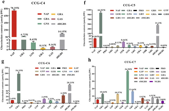 Comparison of the types and contents of glucosinolates of crude extracts (a), collections by acidic alumina column chromatography (b), and collection fractions (collection 2–7) by preparative reversed-phase liquid chromatography (c–h). The seventeen individual glucosinolates included gluconapin (NAP), glucobrassicanapin (GBA), progoitrin (PRO), glucojiaputin (GJP), gluconapoleiferin (GNF), glucoraphasativusain (GRS), glucotropaeolin (GTP), glucoerucin (GER), gluconasturtiin (GNS), glucoberteroin (GBT), glucoraphanin (GRA), glucobarbarin (GBB), glucobrassicin (GBS), glucoalyssin (GAS), hydroxyglucobrassicin (4HGBS), 4-methoxyglucobrassicin (4MGBS), and neoglucobrassicin (NGBS). The percentage marked directly above the bar chart represents the purity of the corresponding glucoside. Data are presented as the mean ± SD (n = 3).