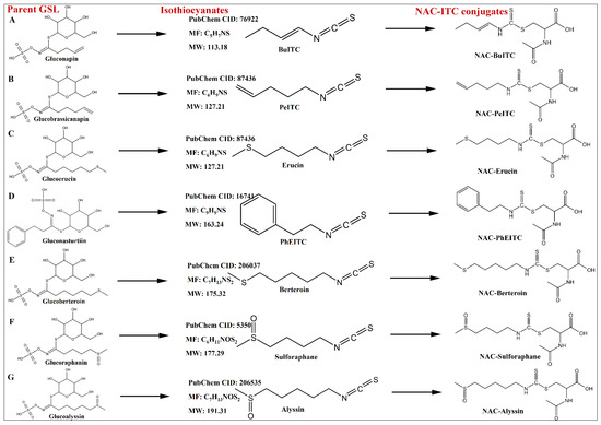 Structures of the identified isothiocyanates, the parent glucosinolates, and NAC-ITC conjugates. PubChem CID, PubChem Identifier from the database of chemicals; MW, molecular weight (g/mol); MF, molecular formula.