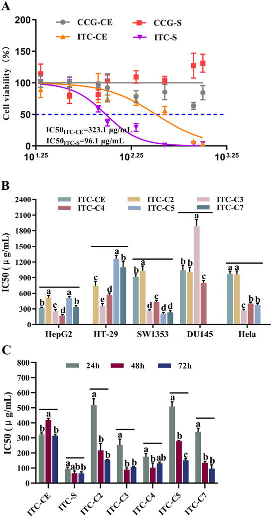 The anticancer activity of glucosinolates and isothiocyanates in vitro. (A) The effect of different concentrations of CCG-CE, CCG-S, ITC-CE, and ITC-S on HepG2 cell viabilities. (B) IC50 values of ITC-CE and ITC-(C2-C7) on different tumor cell lines for 24 h. (C) IC50 values of ITC-CE, ITC-S, and ITC-(C2-C7) on HepG2 cells for 24 h, 48 h, and 72 h. Different lowercase letters (a, b, c, d, and e) indicated significant differences (n = 6, one-way ANOVA; LSD and Tamhane T2’s tests; p < 0.05).