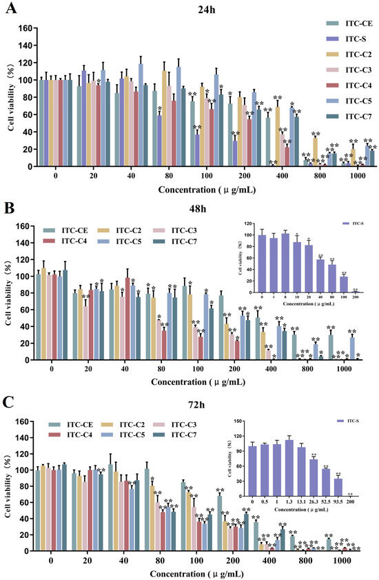 The cell viabilities of different concentrations of ITC-CE and ITC-(C2-C7) on HepG2 cell viabilities for 24 h (A), 48 h (B), and 72 h (C). ‘*’ (p < 0.05) and ‘**’ (p < 0.01) indicated significant differences compared with the normal control group (n = 6, one-way ANOVA; LSD and Tamhane T2’s tests).