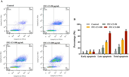 HepG2 cells were plated in a 6-well plate at a density of 2 × 105 cells/mL, incubated for 24 h, and treated with 2 mL of different concentrations of ITC-C3 (50 μg/mL, 100 μg/mL, and 200 μg/mL) for 48 h, each group with 3 replications. The supernatant and cells were collected after being centrifuged at 1000 r/min for 3 min. Cells were washed with ice-cold PBS and gently resuspended by pipetting. The cell suspension was centrifuged at 1000 r/min for 3 min. The supernatant was discarded. The cell pellet was resuspended in an appropriate volume of 1× Binding Buffer. Cell concentration was determined microscopically and adjusted to 1 × 106 viable cells/mL using 1× Binding Buffer. Next, 100 µL of the cell suspension (containing 1 × 105 cells) was transferred to a 1.5 mL microcentrifuge tube, and the apoptosis of cells was estimated using the Annexin V-FITC/PI apoptosis kit (Multi Sciences (Lianke) Biotech, Co., Ltd., Hangzhou, China). Then, 5 µL of Annexin V-FITC and 5 µL of Propidium Iodide (PI) staining solutions were added to the cell suspension in each tube. Tubes were gently mixed and incubated for 15 min at RT in the dark. Following this, 400 µL of 1× Binding Buffer was added to each tube to resuspend the cells. Stained samples were analyzed using flow cytometry (Cytoflex-LX, Beckman, Brea, CA, USA) within 1 h of completing the staining procedure. Annexin V-FITC: detected in the FITC channel (excitation [Ex] = 488 nm; emission [Em] = 530 nm). Propidium Iodide (PI): detected in the PI/PE-Texas Red channel (Ex = 535 nm; Em = 615 nm).