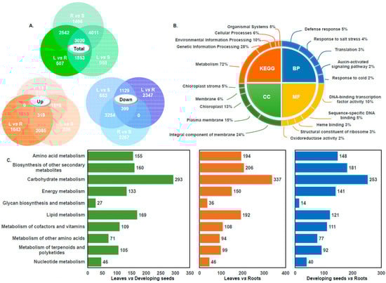 Quantitative statistics of differential genes and analysis of transcription data annotation results. (A) Venn diagrams illustrating the distribution of DEGs across three tissue types: leaf (L), root (R), and developing seed (S). The green diagram represents the total DEGs, the orange diagram highlights upregulated DEGs, and the blue diagram shows downregulated DEGs. (B) Functional classification of DEGs based on GO and KEGG pathway annotations. The bar charts display the top five terms in each GO category (biological process, cellular component, molecular function) and KEGG pathways. (C) DEGs involved in metabolic pathways, with different colors representing different tissue comparison groups.