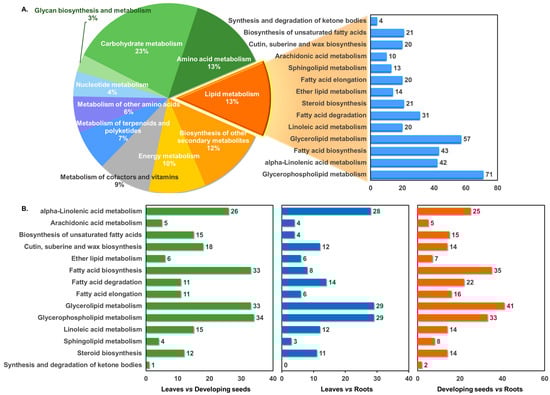 KEGG function classification and lipid-metabolism pathway enrichment analysis. (A) Distribution of metabolism-related DEGs annotated in the hemp transcriptome, with each color representing a different metabolic pathway. (B) DEGs associated with lipid-metabolism pathways across different tissue comparisons. Distinct colors indicate different comparison groups.