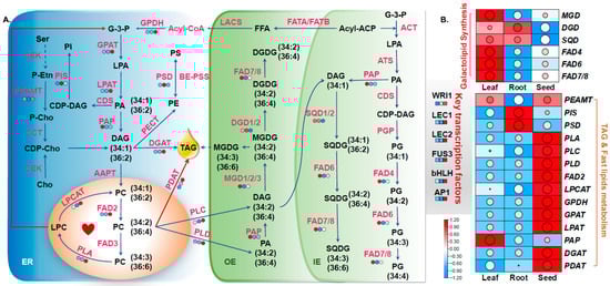 Triacylglycerol (TAG) is the primary constituent of vegetable oils and serves as the main storage form of carbon and energy in plants. It is predominantly accumulated in specific tissues and plays a vital role in seedling development, lipid homeostasis, and the reproductive processes [10]. Fatty acids form the fundamental building blocks for TAG synthesis. In plants, TAG biosynthesis involves two major stages: fatty-acid synthesis within plastids and subsequent TAG assembly in the endoplasmic reticulum (ER) [11]. While the specific TAG biosynthetic pathways may vary across species, it is estimated that over 90% of seed fatty acids are funneled into TAG via PC intermediates [12]. Otherwise, the cell membrane is primarily composed of three major classes of lipids: glycerolipids, sphingolipids, and sterols [13]. Among these, glycerolipids serve as the principal structural components, with variations in the fatty acyl chain composition and ratios across different membrane systems. Phospholipid biosynthesis mainly occurs in the endoplasmic reticulum (ER), and common plant phospholipids include phosphatidic acid (PA), PC, phosphatidylethanolamine (PE), phosphatidylserine (PS), phosphatidylglycerol (PG), and phosphatidylinositol (PI) [14]. Glycolipids in plants exhibit structures similar to phospholipids and are categorized, based on their saccharide head groups, into monogalactosyldiacylglycerol (MGDG), digalactosyldiacylglycerol (DGDG), and sulfoquinovosyldiacylglycerol (SQDG) [15,16]. MGDG and DGDG are predominant in photosynthetic tissues and are unique to photosynthetic membranes. Alongside PG, they are essential components of the plasma membrane and play a critical role in plant photosynthesis [17]. Phospholipids are transported from the ER to chloroplasts, where they provide diacylglycerol (DAG) precursors for glycolipid biosynthesis. The composition of membrane lipids is intricately linked to the lipid synthesis, transport, turnover, remodeling, and degradation processes [18].