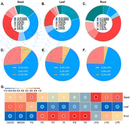 The concentrations of each lipid class of hemp in different tissues. Pie charts illustrating the proportional distributions of major lipid classes in developing seeds (A), leaves (B), and roots (C) of hemp. (D–F) Pie charts showing the distribution of lysophospholipid subclasses in seeds (D), leaves (E), and roots (F). Distinct colors represent different lipid classes. (G) Heat map displaying the relative concentration of each lipid class across hemp tissues. The color gradient indicates the concentration levels, with red denoting high abundance and blue indicating low abundance.