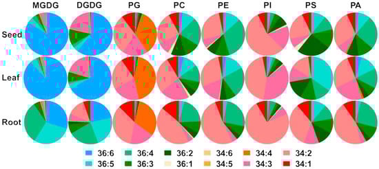In addition to profiling overall lipid classes, the molecular species of the major lipid-associated fatty-acid side chains in hemp were analyzed. The predominant lipid molecular species in hemp were found to be C34 and C36, with galactolipids mainly consisting of C36 species—particularly C36:6, which emerged as the most abundant subtype (Figure 6). Within MGDG, the molar percentage of C36:6 in leaf tissue reached as high as 88%, significantly higher than in seeds or roots. For DGDG, the dominant molecular species in seeds and leaves were C34:3 and C36:6, while in the roots, C36:5, C36:4, C34:2, and C34:1 were more prevalent. Overall, the predominance of C36:6 in both MGDG and DGDG across tissues suggests that these galactolipids are primarily synthesized via the eukaryotic (endoplasmic reticulum-derived) pathway, indicating that hemp is a typical 18:3 plant. The phospholipid species in hemp were also dominated by C34 and C36 molecules, with C34:2 and C36:4 being the most abundant. In PG, C34 was the primary species, with C34:4, C34:3, and C34:2 dominating across tissues. In PC, C36:4 and C34:2 were the major species in developing seeds and roots, while C34:2 was predominant in leaves. The molecular profile of PE closely resembled that of PC, with C36:4 and C34:2 being most abundant in developing seeds. For PI, the composition was similar to that of PG, with C34 species predominating, especially C34:2 and C34:3. C34:2 was particularly dominant in seeds and root tissues. PS, though present in lower amounts, was enriched in the C36:5 species across tissues compared to other lipid classes. In PA, C34:2 and C36:4 were predominant in seeds and roots, while C34:2, C34:3, C36:4, and C36:5 were the major molecular species in leaves.