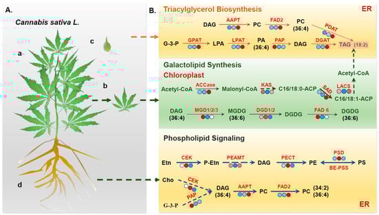 In conclusion, this study conducted transcriptomic and lipidomic integration analysis on developed hemp seeds, leaves, and root tissues. The results revealed that the DEGs associated with lipid metabolism were primarily enriched in glycerophospholipid metabolism, glycerolipid metabolism, and fatty-acid biosynthesis. In parallel, lipidomic profiling identified 11 distinct lipid classes across the tissues. Leaves were dominated by galactolipids, accounting for 65.4% of the total lipids, with C36:6 as the predominant species—consistent with the characteristic “18:3 plant” lipid profile. The roots showed a high abundance of phospholipids, representing 84.9% of their lipid composition. The seeds, meanwhile, were rich in PC and galactolipids. Transcriptomic analysis revealed that the lipid composition of hemp seeds is closely linked to the expression of genes involved in lipid metabolism, exhibiting a clear tissue-specific expression pattern. Genes associated with TAG biosynthesis were predominantly and highly expressed in developing seeds, whereas genes involved in galactolipid synthesis were most abundant in leaf tissues and those related to phospholipid biosynthesis showed the highest expression in root tissues. SAD, FAD2, and FAD3 show high expression levels in developing seeds. This likely contributes to the cumulation of unsaturated fatty acids, particularly PUFAs, in hemp. The findings of this study offer valuable insights into the molecular regulation of lipid metabolism in C. sativa and establish a theoretical foundation for future research. Furthermore, these results provide important genetic resources for the improvement of oil yield and quality in hemp and other oilseed crops through targeted breeding or biotechnological approaches.