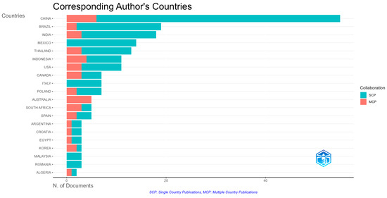 In the production by country analysis, China stands out in first place, showing a greater contribution that far exceeds other countries. It is followed by countries such as Brazil and India, which, like China, reflect co-authorships with researchers from different countries. Mexico also appears in this list; however, this country shows co-authorships with institutions from the same country, i.e., they have no international collaborations. The following countries are also identified in decreasing order: Thailand, Indonesia, USA, Canada, Italy, Poland, Australia, South Africa, Spain, Argentina, Croatia, Egypt, Korea, Malaysia, Romania, and Algeria. It is important to mention that Italy, Malaysia, and Romania are characterised by the fact that their collaborations are only national, unlike the rest of the countries, which have international links (Figure 2). It should be clarified that numbers do not always imply effective collaboration or efficient production in terms of scientific product quality. More in-depth analyses could reveal more detailed information.