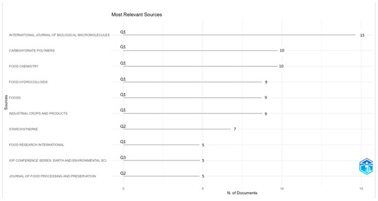 Figure 3 shows the journals with the highest number of publications related to the topic. The sources highlighted mainly belong to the first (Q1) and second (Q2) quartile according to the Scimago Journal & Country Rank (SJR) for the year 2024 (SJR, 2025), which reflects a high impact and scientific quality. The International Journal of Biological Macromolecules tops the list with 15 publications, consolidating its position as the most influential source in the field. It is followed by Carbohydrate Polymers and Food Chemistry, both with 10 publications, then Food Hydrocolloids, Foods, and Industrial Crops and Products, with 9 publications each. These six journals are ranked in the first quartile, which supports the strength and relevance of their research. On the other hand, sources such as Starch/Stärke (Q2), Food Research International (Q1), IOP Conference Series: Earth and Environmental Science (Q3), and Journal of Food Processing and Preservation (Q2) present a smaller number of papers (between three and seven) but are still relevant in the field of resistant starches.