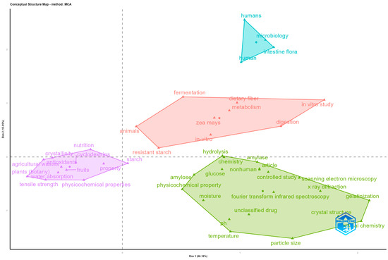 From the point of view of the variety of concepts handled in the works related to the study of RSs, their properties, and functional applications, Figure 4 clearly shows four differentiated clusters that group together the main thematic lines addressed in the literature analysed. At the bottom right of the graph is the cluster with the highest number of associated terms, including amylose, physicochemical property, temperature, moisture, crystal structure, X-ray diffraction, and scanning electron microscopy. These items are related to studies focusing on the structural and physicochemical characterisation of starch and its derivatives, using advanced analytical tools such as spectroscopy, X-ray diffraction, and electron microscopy. This thematic line reflects a focused approach to the technical and molecular understanding of resistant starches and its functional properties.