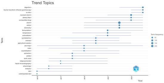 During 2023, the most frequent topics were resistant starch, dietary fibre, and unclassified drugs. A study on ginger starch was conducted in which the effect of different freeze–thaw cycles on its properties was evaluated. It was observed that as the number of cycles increased, the content of resistant starch, amylose, and total starch increased [88]. Furthermore in 2024, the terms digestion, Fourier transform infrared spectroscopy, and in vitro were highlighted. Relevant studies include the production of noodles from a mixture of rice flour and pineapple stalk starch, an agricultural by-product, showing favourable functional properties [30]. Finally, the data analysed in our study extended only up to March 2025; therefore, the trend themes are not presented in Figure 6. Nevertheless, we were able to identify several noteworthy studies, such as that of Yüce et al. [89], which involved a risk assessment of essential oils extracted from orange peel.